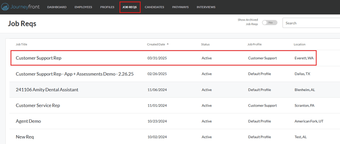 - Click the “JOB REQS" tab in the top navigation bar and select the appropriate Job Req