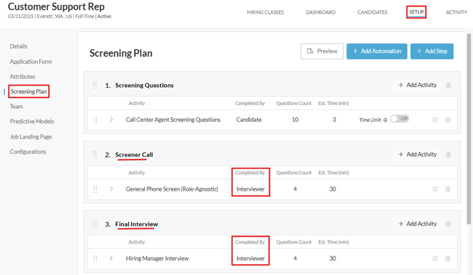 - Click on "SETUP" and then "Screening Plan". As you can see in the screenshot below, only one 'Step' is labeled as an interview ( Step "3: Final Interview"), but you can see that are 2 'Interview Activities' in the screening plan for this Job Req (Step "2. Screener Call" is conducted as an interview). Therefore interview details need to be set up for both interviews. We'll focus on the 'Final Interview' for our example.
