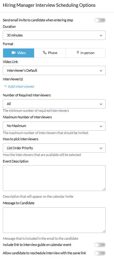 - Send email invite to candidate when entering step: Toggle whether or not you would like to send an email inviting the candidate to schedule an interview once they've been added to the interview step
