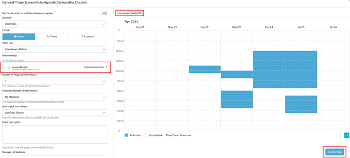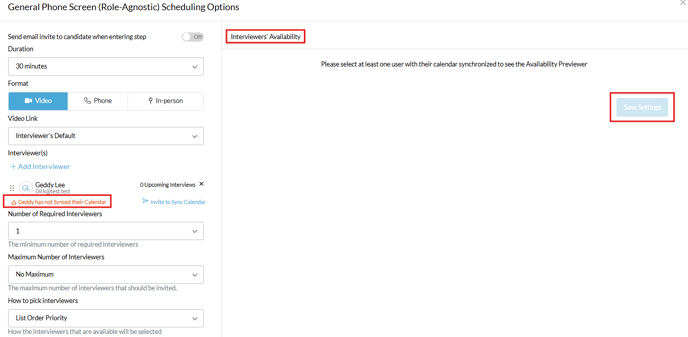- If the 'Save Settings' button is greyed out, it's indicating that you need to add at least one user/interviewer who has synchronized their calendar. Once you do that, you'll see the 'Interviewers Availability' message towards the top of the screen and you'll be able to click the 'Save Settings' button.